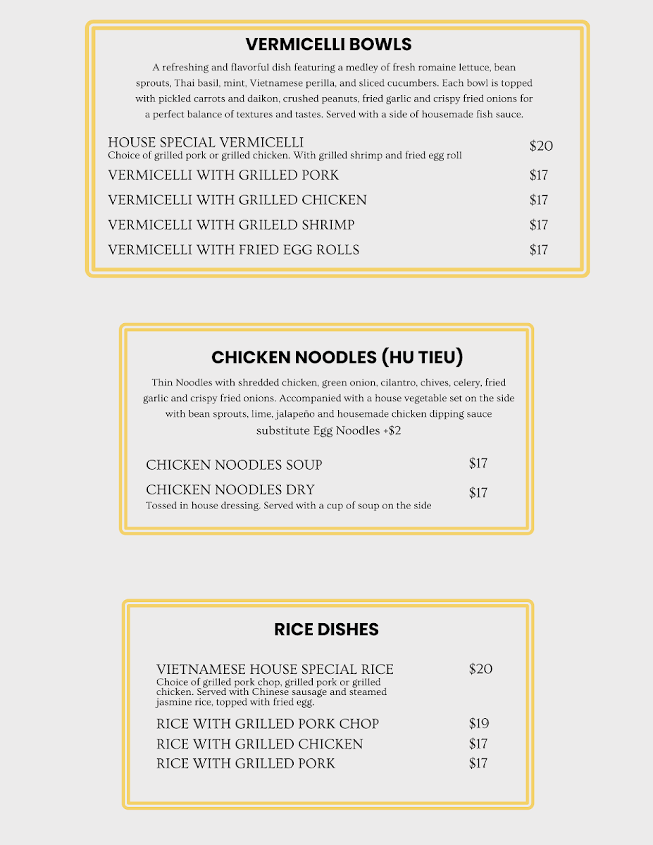 Located in Henderson, NV, Let's Get Pho offers a vibrant selection of authentic Vietnamese dishes that are sure to tantalize your taste buds. Their menu features a range of Vermicelli Bowls, including house specials like grilled pork and egg rolls, alongside robust Rice Dishes featuring options such as grilled chicken and pork chop with rich accompaniments. Each bowl bursts with fresh herbs and vegetables, creating a refreshing balance to the savory proteins.